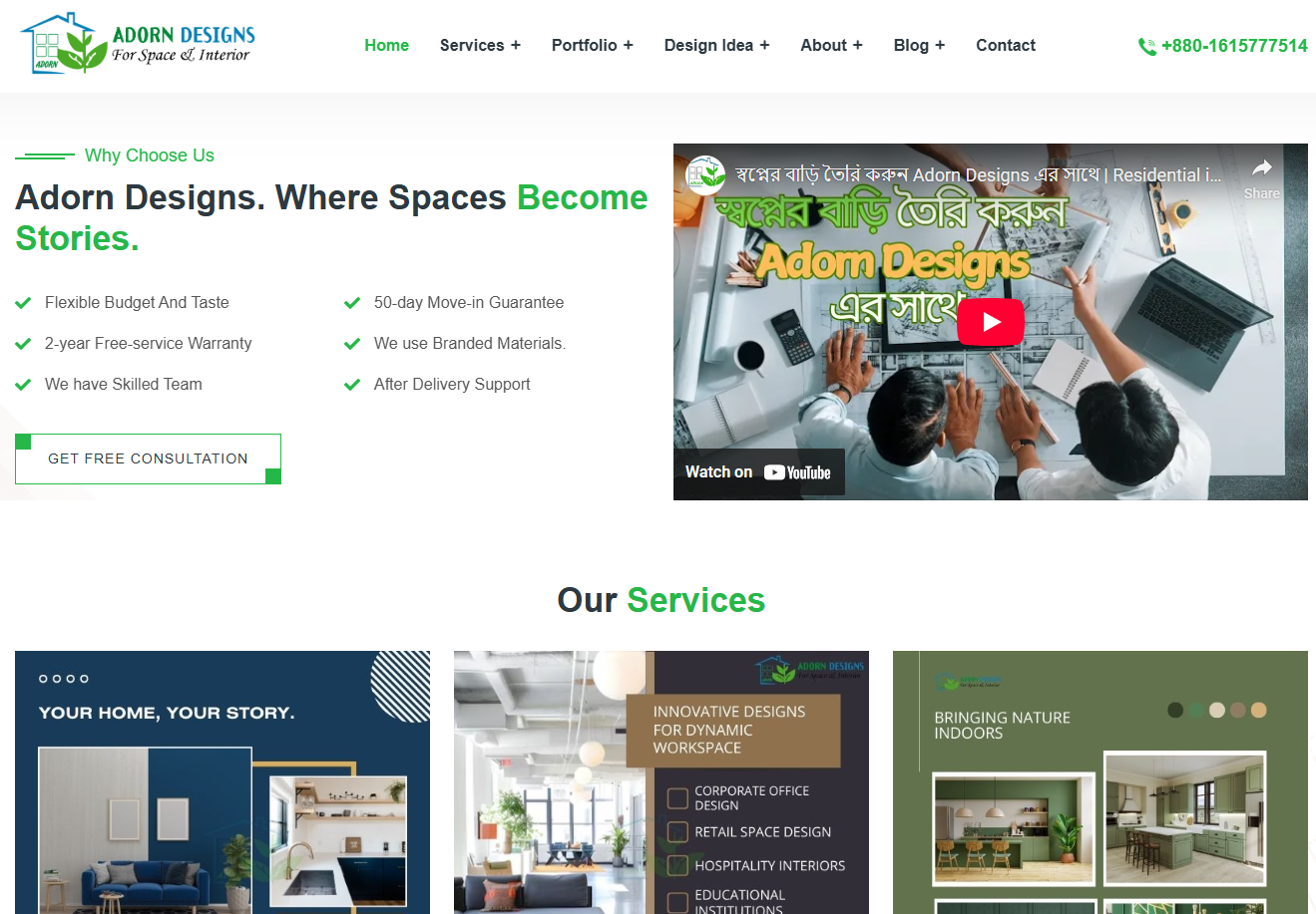 Amico Innovations collaborated with Adorn Designs, a prominent interior design company in Bangladesh, to design and develop a stylish and user-friendly website that highlights their creative expertise. The goal was to build a digital platform that reflects their brand identity while providing an engaging experience for potential clients. The website features a visually rich project portfolio, detailed service sections, and smooth navigation to showcase their design capabilities. Developed using modern web technologies, it offers full responsiveness, fast loading times, and SEO optimization for better online visibility. The site also includes lead capture forms and an easy-to-manage admin panel, helping Adorn Designs connect effortlessly with clients and showcase their work elegantly.
